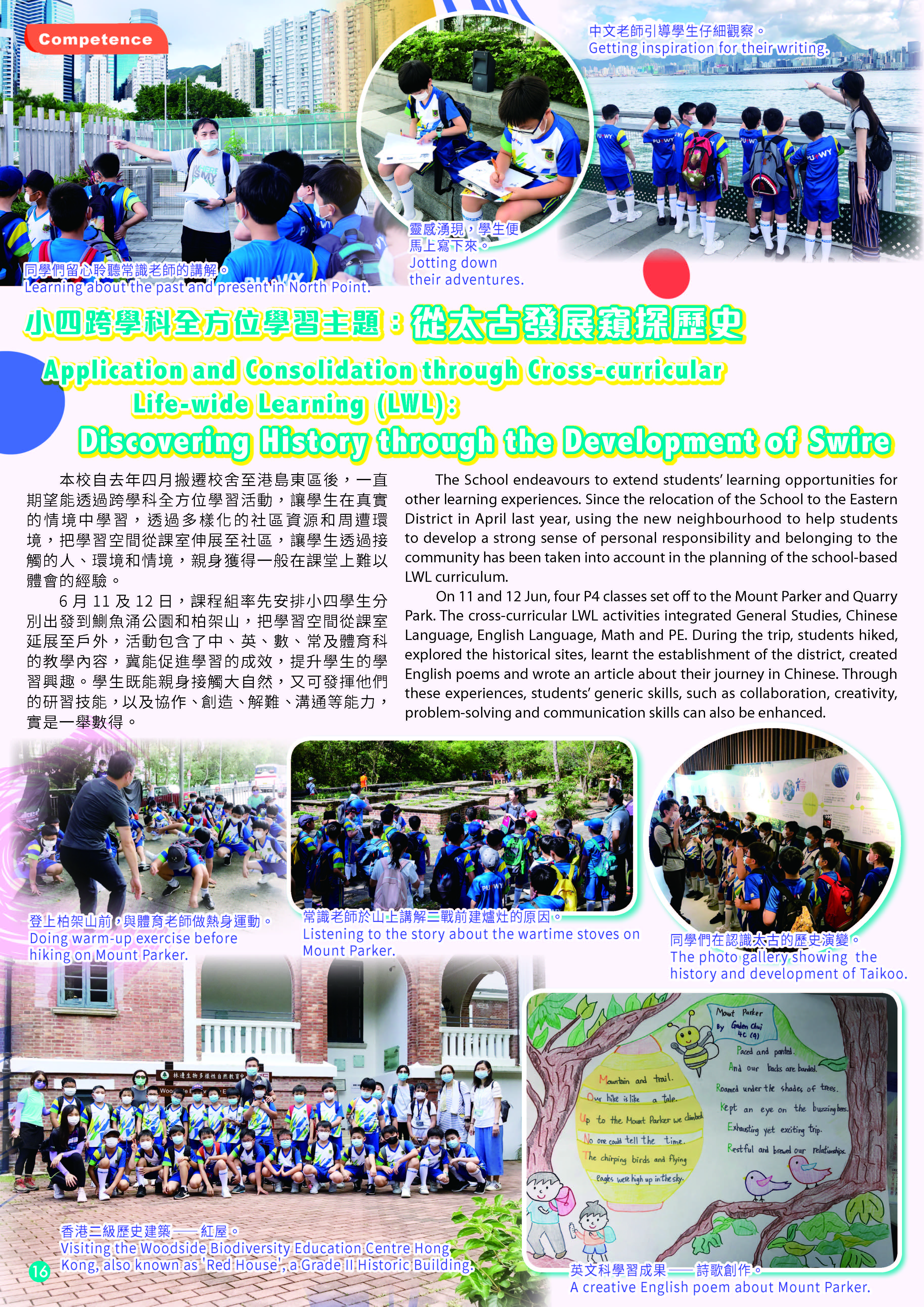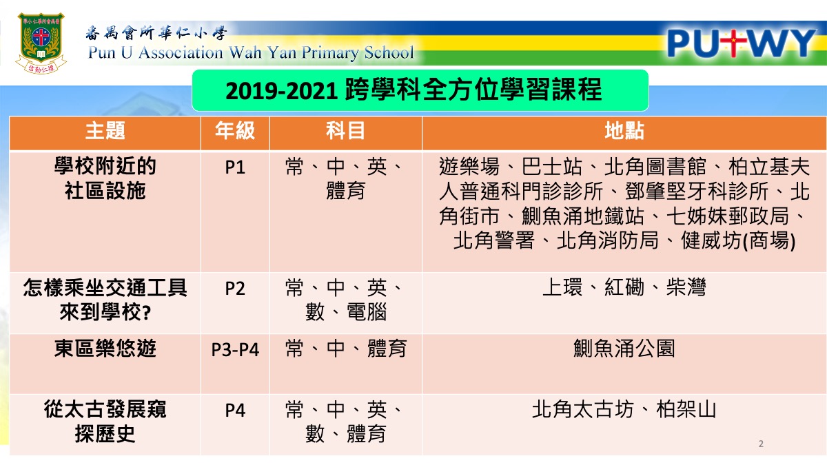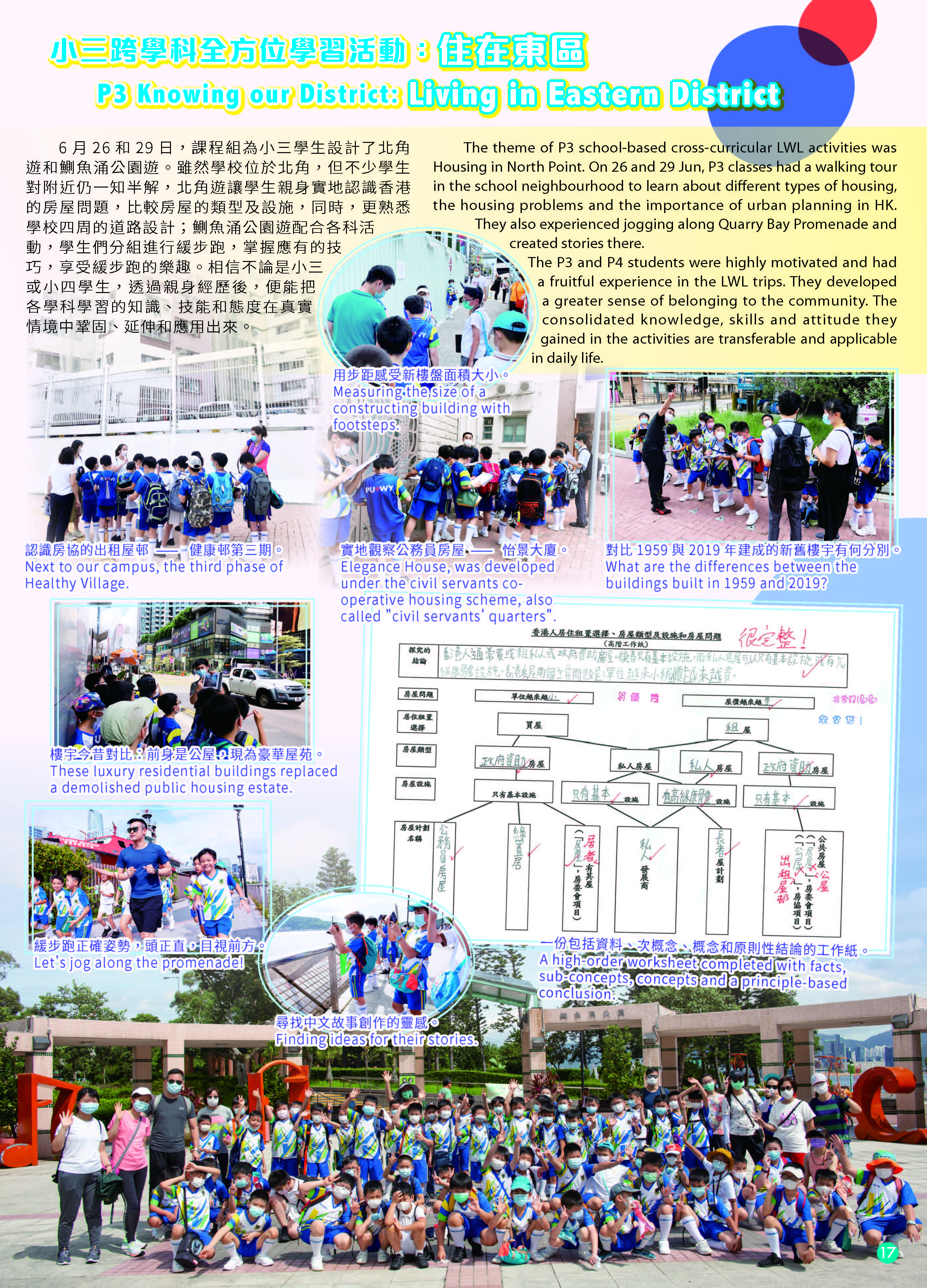 本校自搬遷校舍至港島東區後,一直致力透過跨學科全方位學習活動,利用新的社區資源有利條件豐富學生的學習經歷和效能,讓學生應用、延伸及深化所學,把學習空間從課室伸展至社區,透過接觸的人、環境和情境,親身獲得一般在課堂上難以體會的經驗。