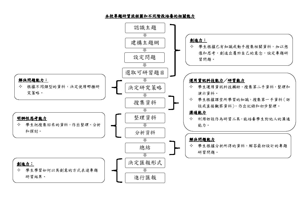 本校的專題研習在三至六年級中實行,根據教育局的指引,專題研習主要提升以下三類能力:
