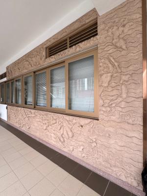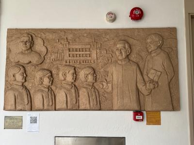 浮雕左邊的潘佐治神父(Fr. George Byrne SJ)為首的愛爾蘭耶穌會士於1926年抵港,在港大建立利瑪竇宿舍,並於1971年由最右邊的校監巴烈德神父(Fr. Cyril Barrett SJ)與番禺會所創立本校(巴神父亦於1967年社會動盪之際重建利瑪竇宿舍)。右邊第二位是連民安神父(Fr. Joseph Mallin SJ),是一位從孩子角度做教育工作的創校校長。這些在香港經歷困難考驗後創立教育事業的耶穌會士,提醒教師教導學生為了夢想不怕冒險,能從失敗中學習。