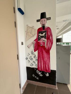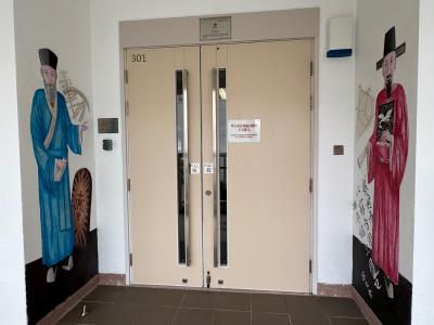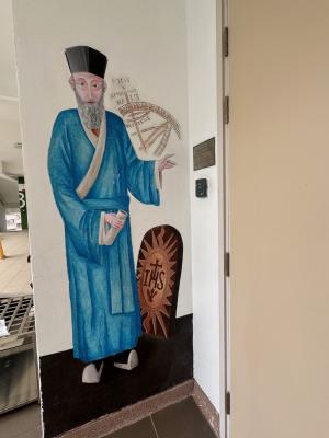 三樓教員室大門的左邊有義大利耶穌會士利瑪竇神父(Fr. Mateo Ricci SJ)與右邊明朝禮部尚書兼大學士徐光啟的文化交談的畫像,提醒老師幫助學生與不同文化交談的重要性。