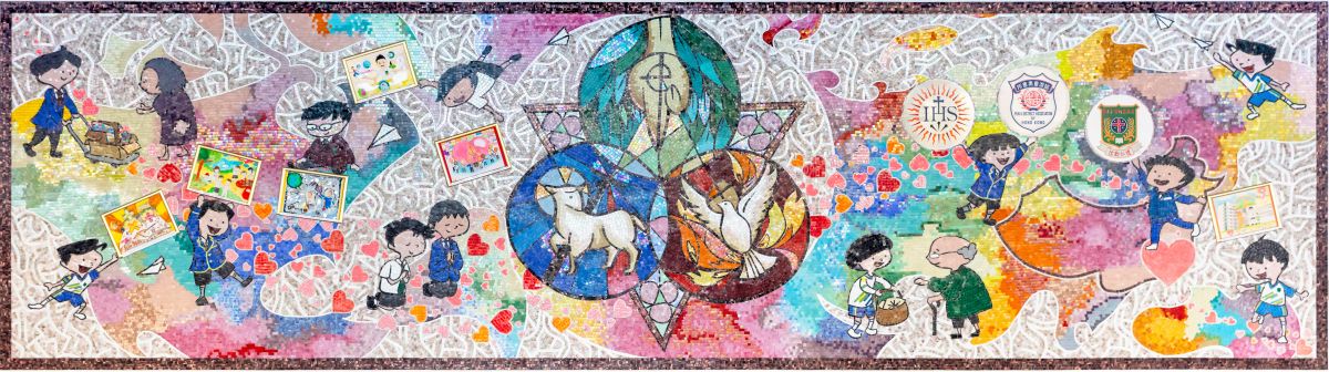 這幅馬賽克壁畫是「聖三環視華小學生及校友在世上活出畢業生特質」馬賽克壁畫。壁畫上有一個願意為他人服務、關心弱小的男孩子,展現出華小畢業生特質。