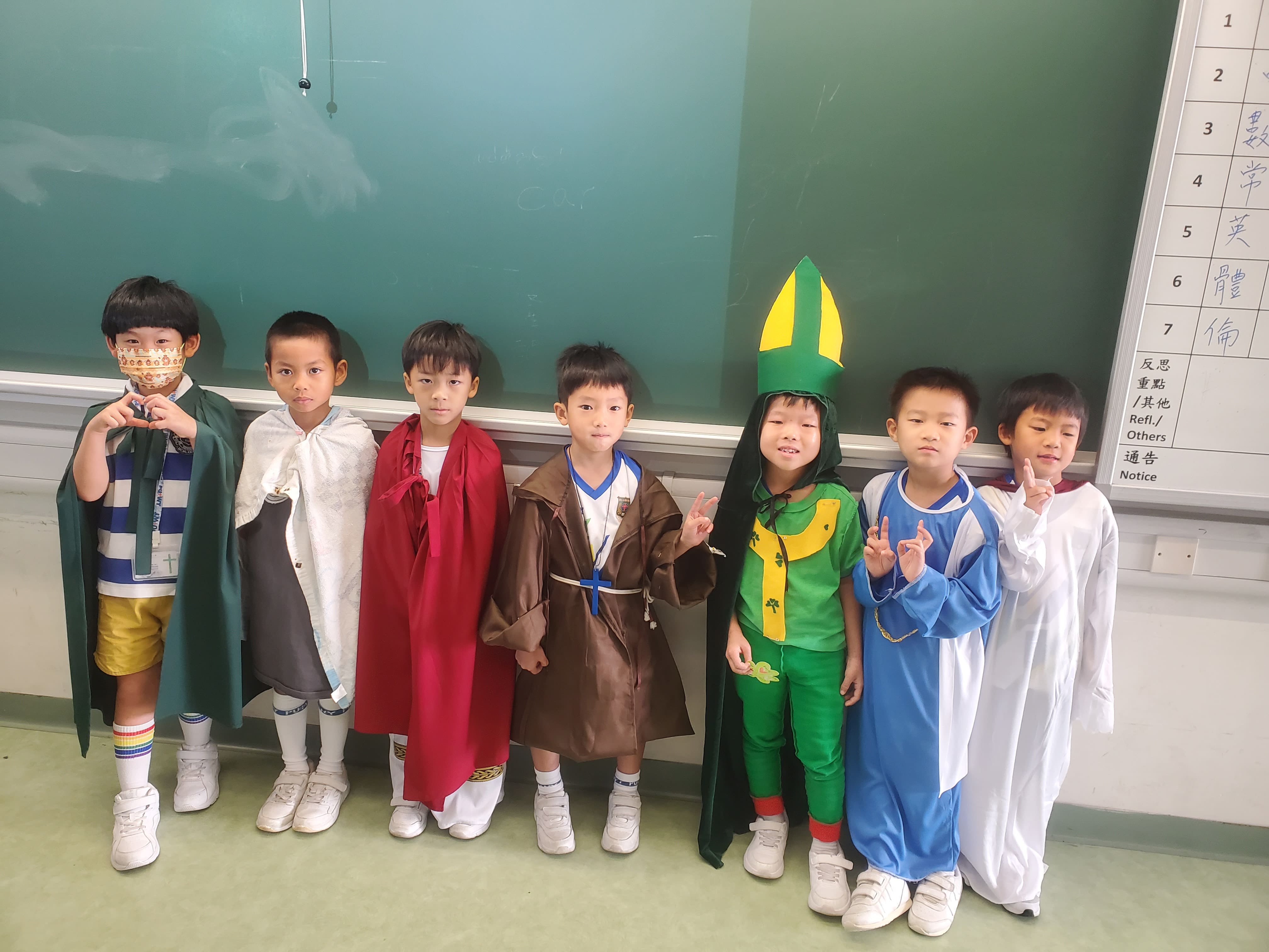 藉著諸聖節聖人扮演活動,讓學生加深對教會諸聖的理解及認同,以聖人的德行為榜樣,並於 活動中體會到諸聖節的精神。