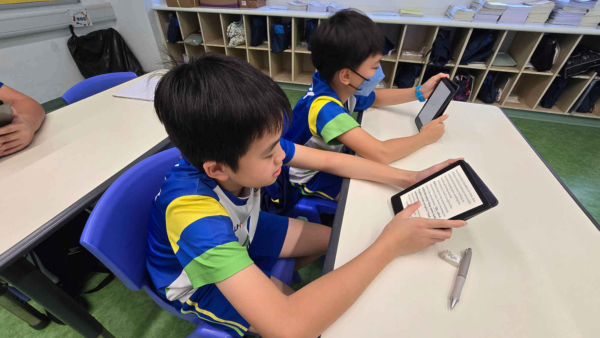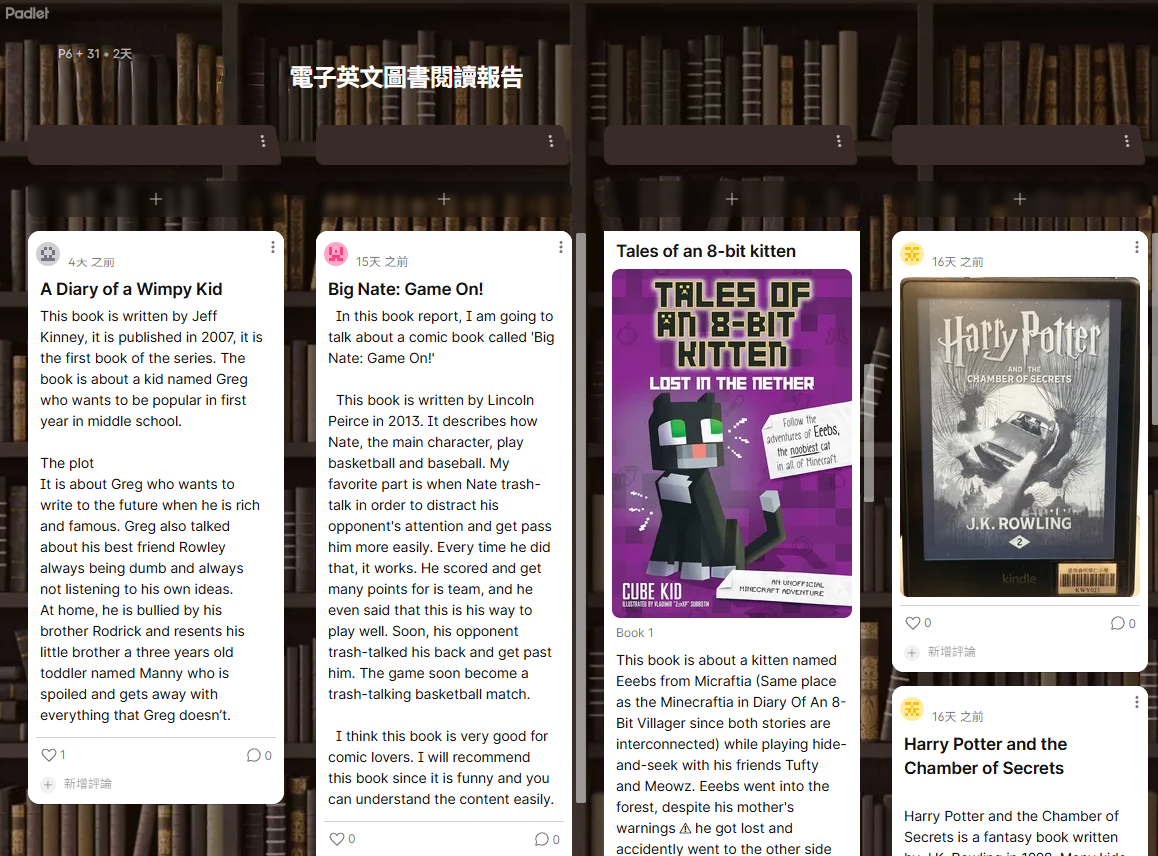 學校訂購英文圖書電子閱讀器,供P.4-P.6學生借閱(由「賽馬會數碼悅讀計劃」資助)。學生在家中利用電子圖書器閱讀圖書後,以電子閱讀器內的圖書完成閱讀報告,並上載到padlet上,與同學分享其閱讀心得。