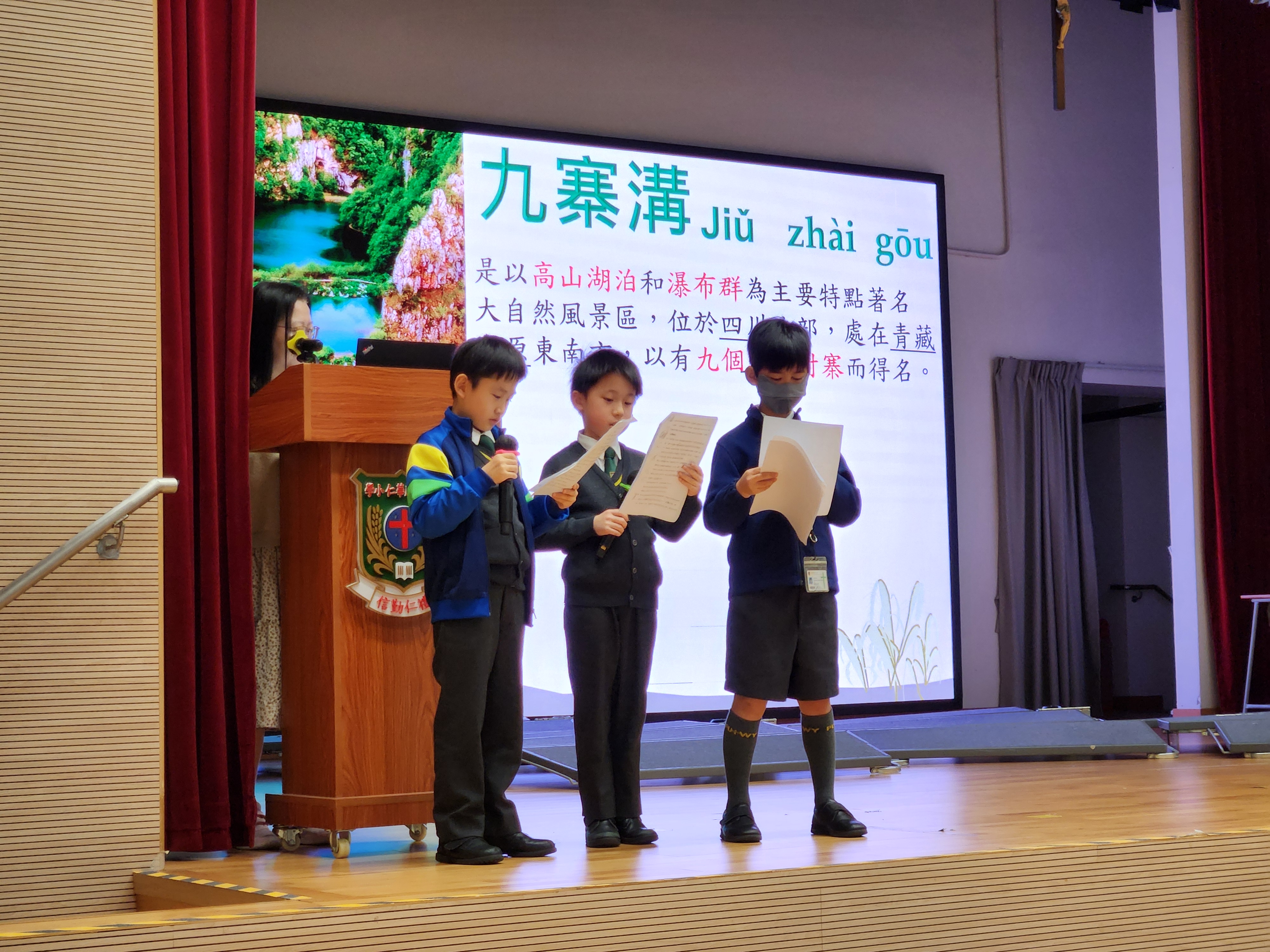 為了提升學生的普通話能力及語言表達技巧,以及加深對中華文化的認識和增強自信心,鼓勵及推薦學生參加校際朗誦節、全港中小學普通話演講比賽、「中華盃」全港中小學中華文化普通話比賽、「小嘴巴·說大道理」―香港電台廣播劇比賽、「曾憲備全港少兒普通話朗誦比賽」等。